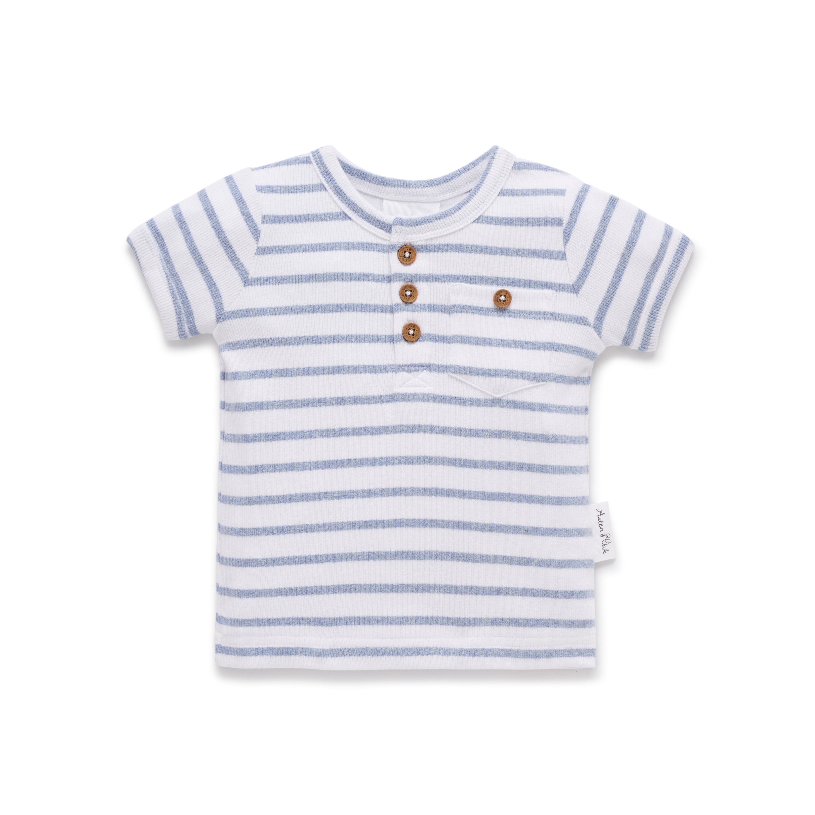 Made from GOTS, certified organic cotton, this classic stripe tee features our henley neckline with wood look buttons and functional front pocket. 95% Certified organic cotton 5% Elastane #USB008294. Made in India. Wash according to care instructions.