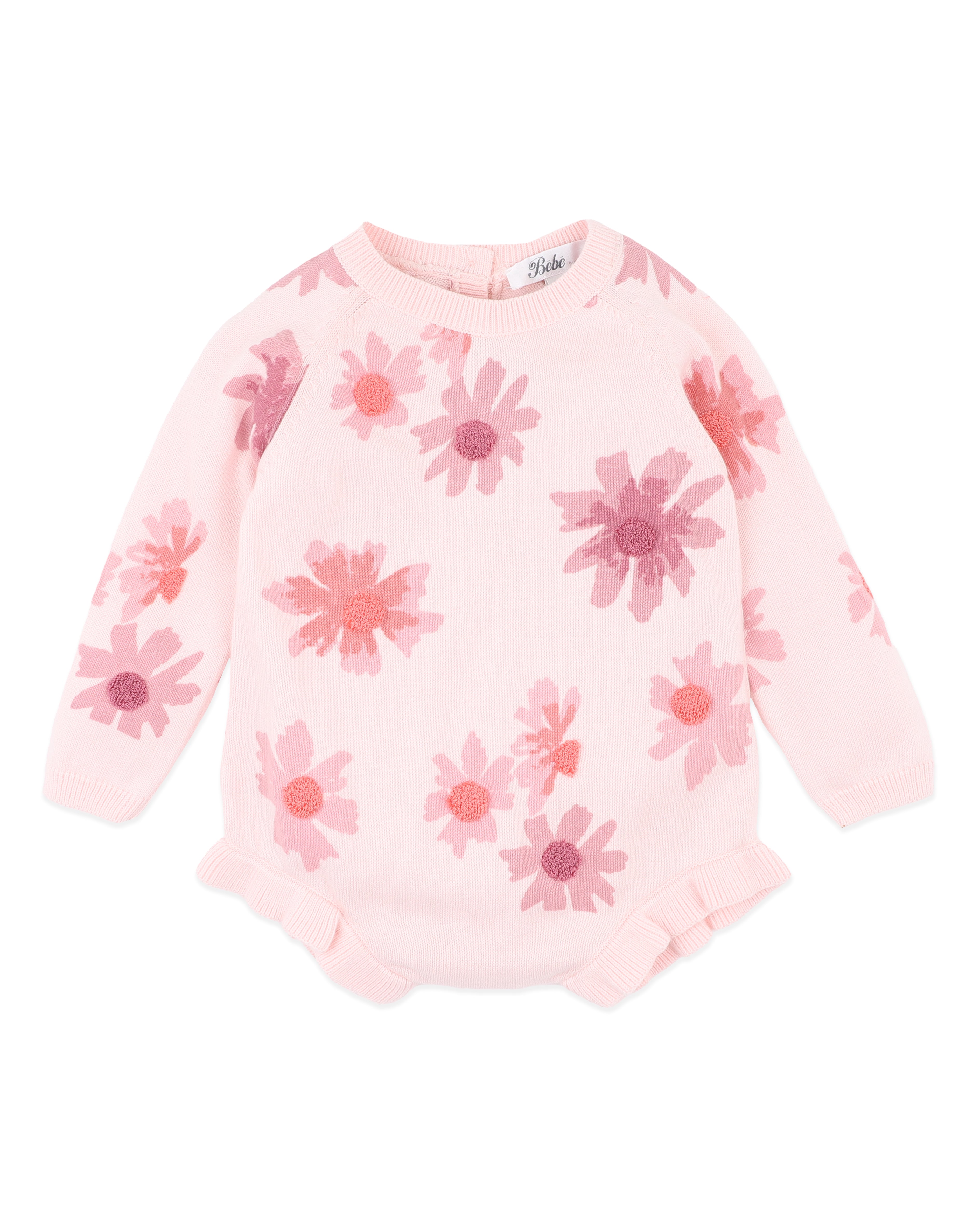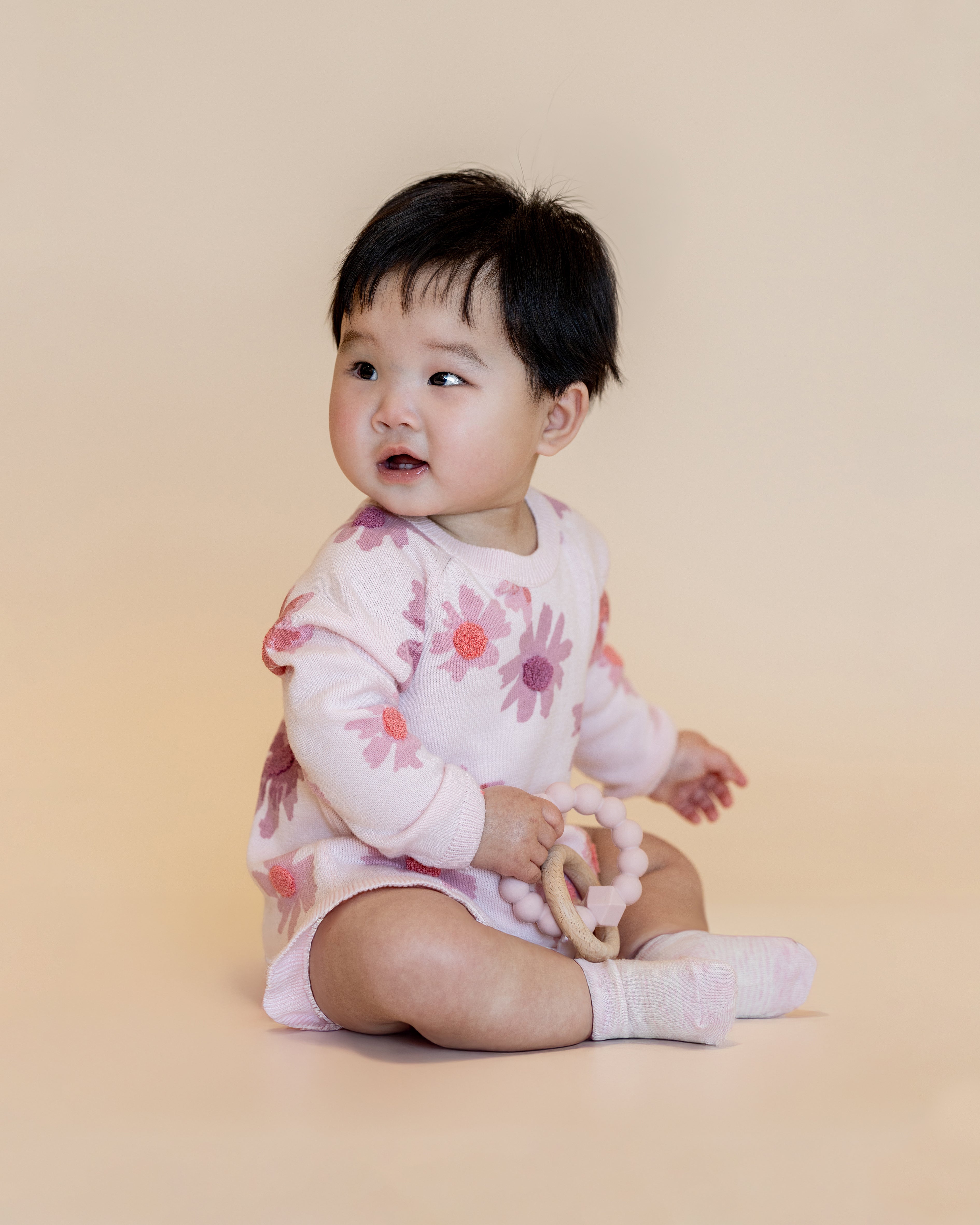A cosy little layer for days filled with play, this sweet knit romper blooms with soft, tonal flowers and tactile bouclé centres your little one will love. Crafted from gentle organic cotton, it’s designed for all-day comfort with easy changes and a flutter of frills at the leg for that extra touch of charm. Wear it back with our knee-high socks or pointelle tights for the cutest, snuggest look.