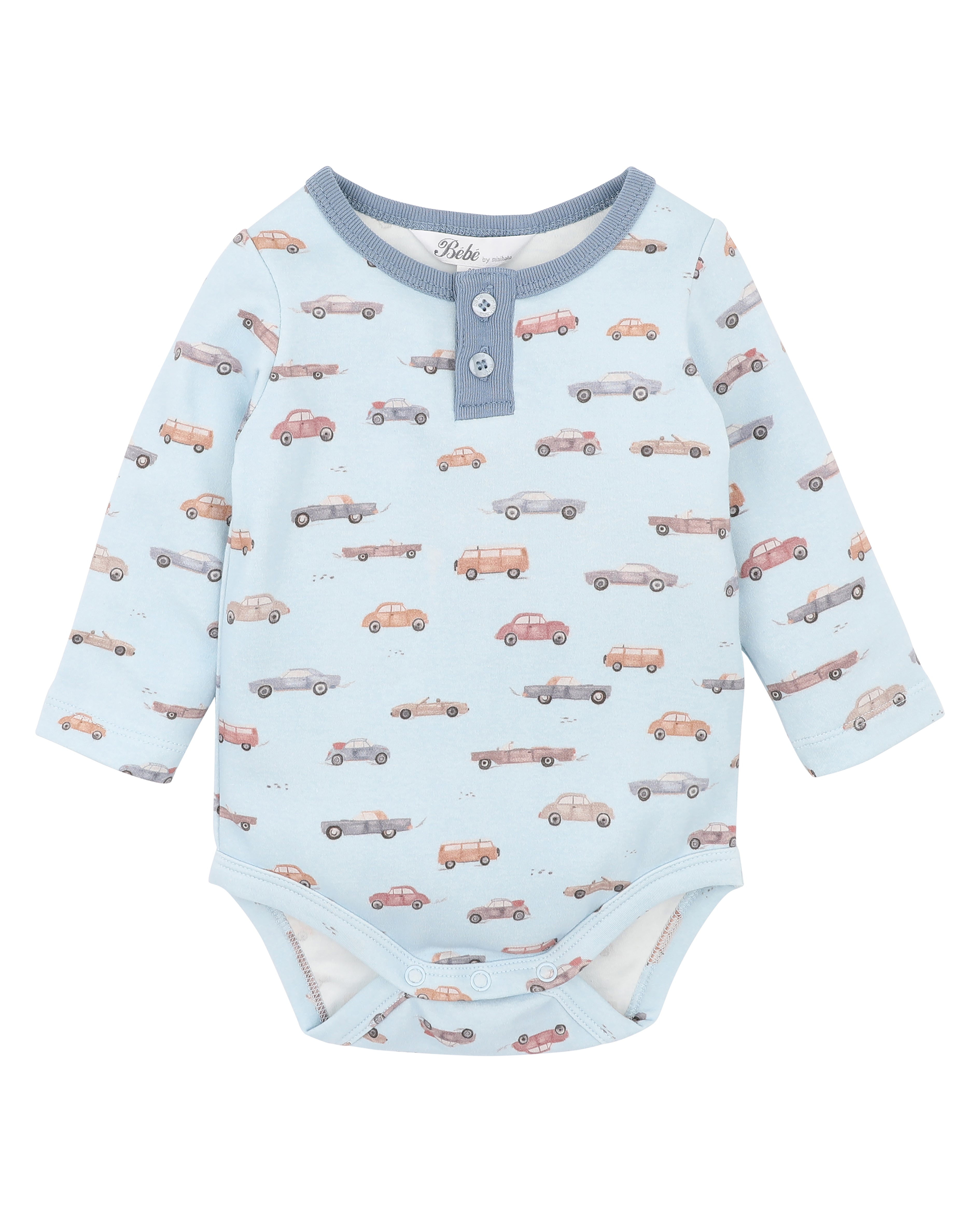 Made for everyday adventures and easy layering, this long sleeve bodysuit features a soft all-over vintage car print in gentle, calming tones. Designed with comfort in mind, it’s crafted from stretchy organic cotton interlock for a snug yet flexible fit, making it perfect for play, sleep, and everything in between. A timeless staple that’s made to mix and match effortlessly with their favourite bottoms.
