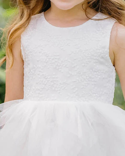 Perfect for special occasions, this beautiful fully lined sleeveless dress features a gorgeous waterfall tulle skirt and embroidered bodice with back zip opening for ease of dressing.