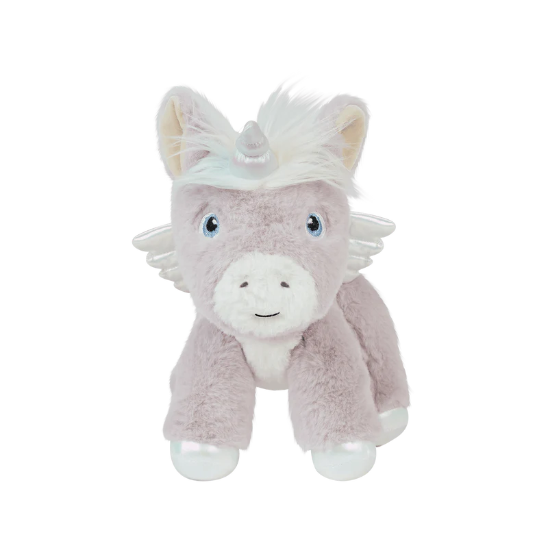 Iridescent accent on the hooves and wings, velvet inner ears, and a plush rainbow tail and mane