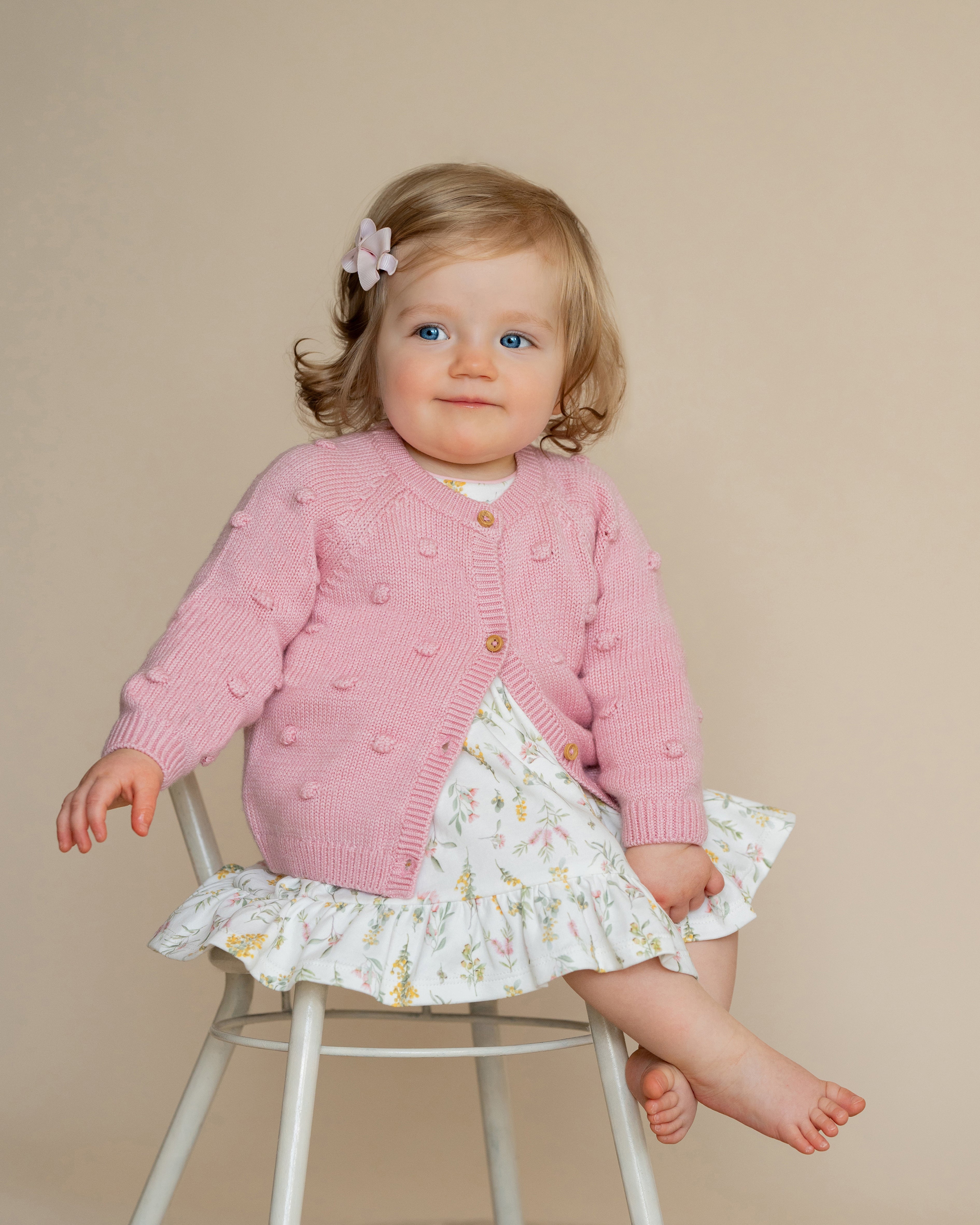 A cosy little layer made for chilly mornings and cuddly moments, this sweet bobble cardigan wraps little ones in warmth with a touch of playful texture. Finished in a pretty blossom hue with delicate bobble detailing throughout, it’s a timeless knit designed to be worn, loved and passed down, perfect for layering over dresses, tees and everyday winter outfits.