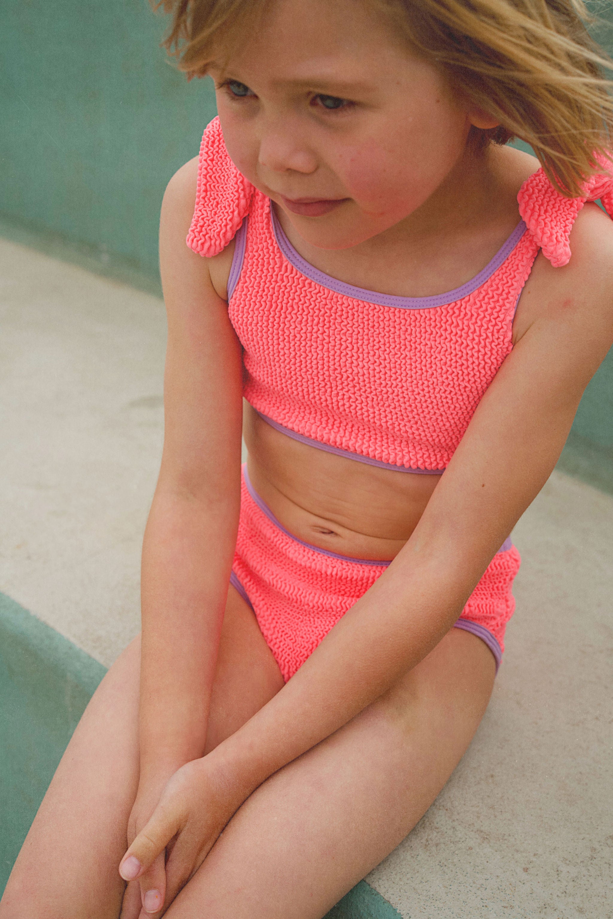 Made from crinkle-stretch swim fabric, it’s breathable, flexible and designed for comfort. The natural stretch allows the bikini to adapt as your child grows, giving it longer wear through the seasons.