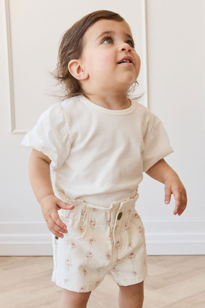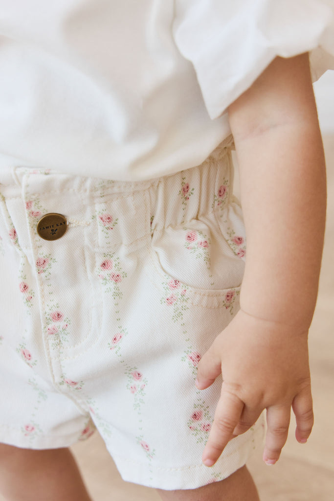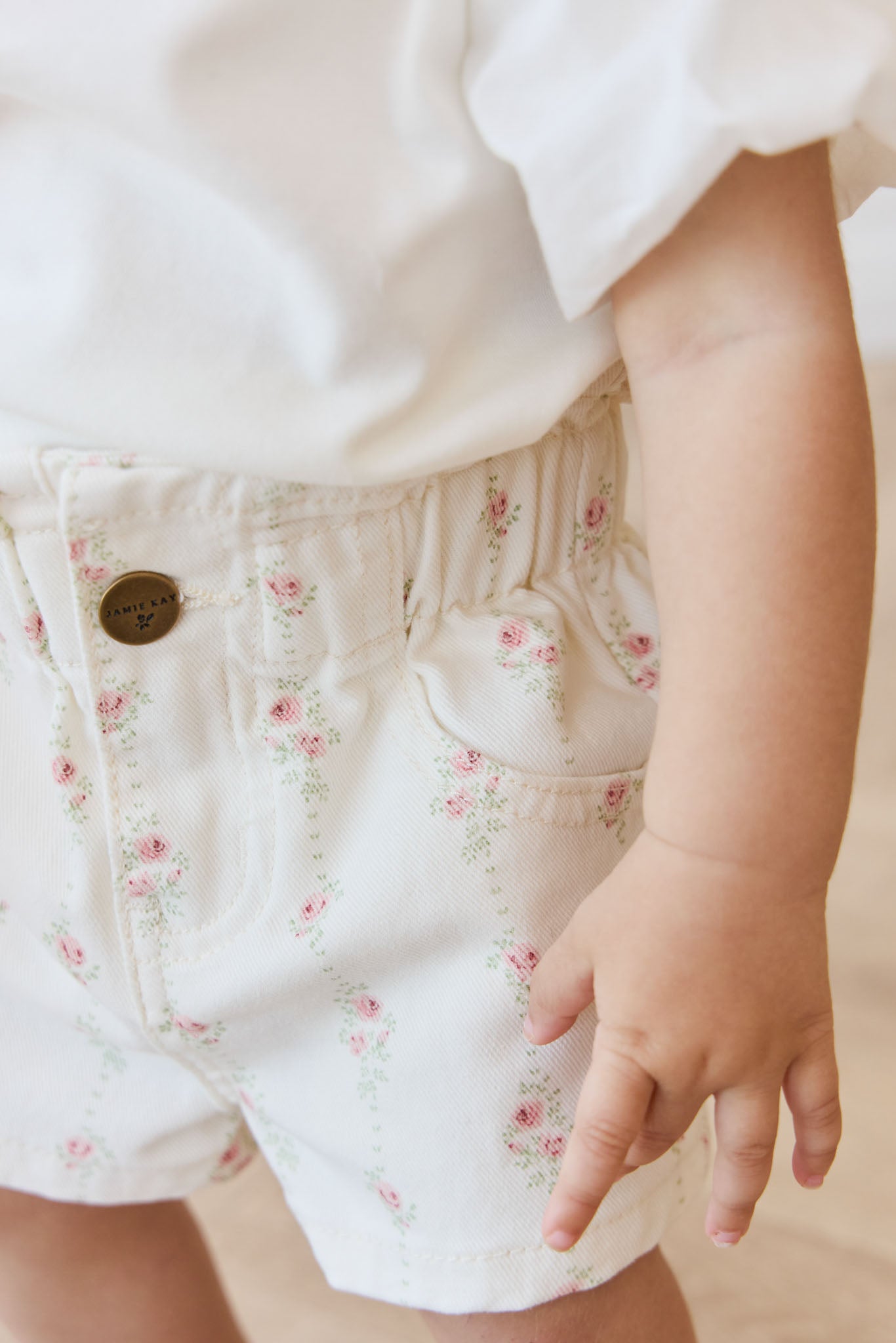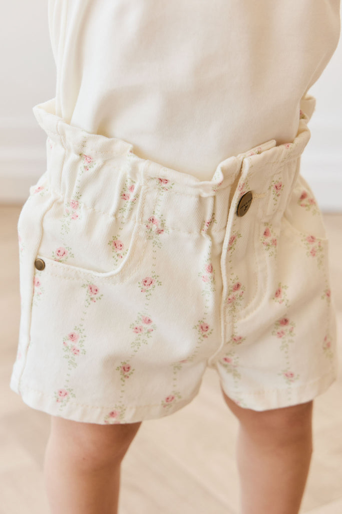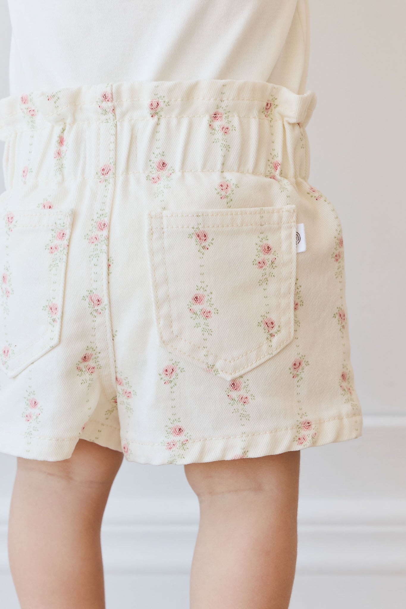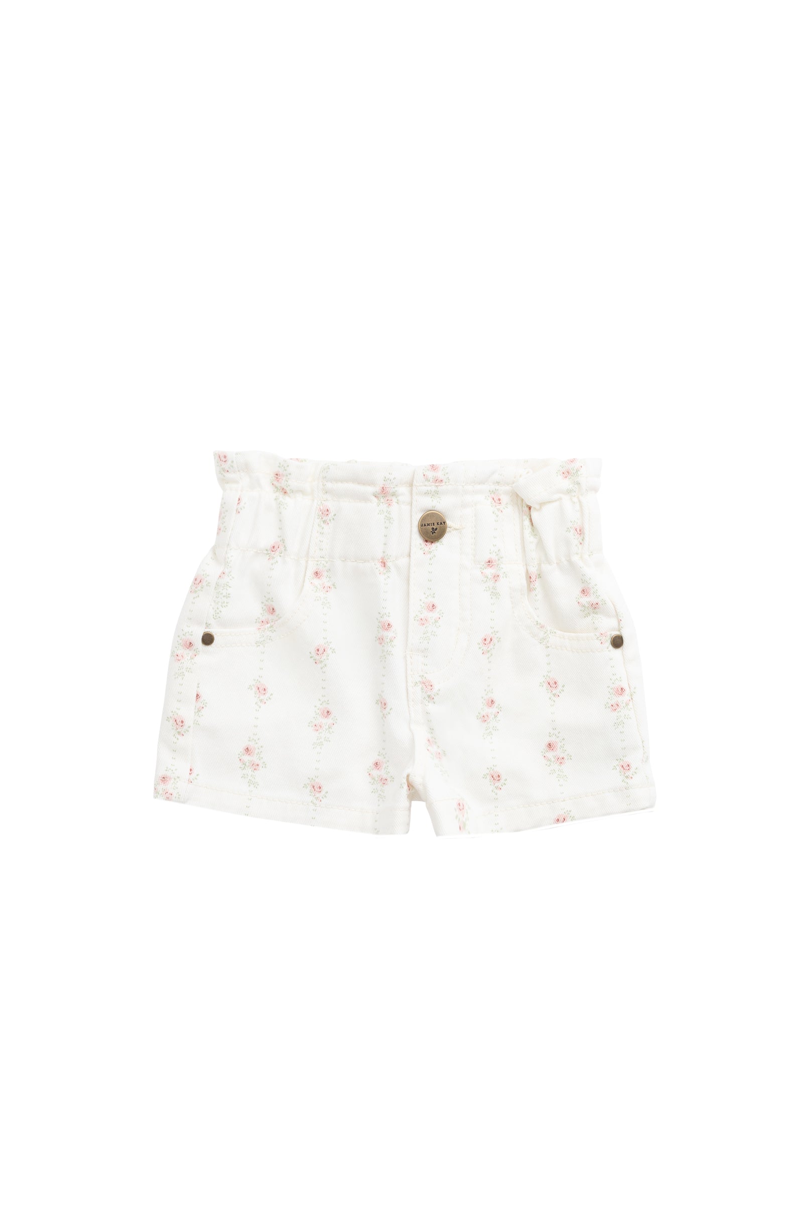 The Kara Short – Rose Trail is a beautifully crafted pair of shorts featuring a delicate vertical floral print in soft pink tones. Designed with an elastic waistband, two front pockets, and nickel-free metal button details, these shorts offer both style and practicality for your little one’s everyday adventures.