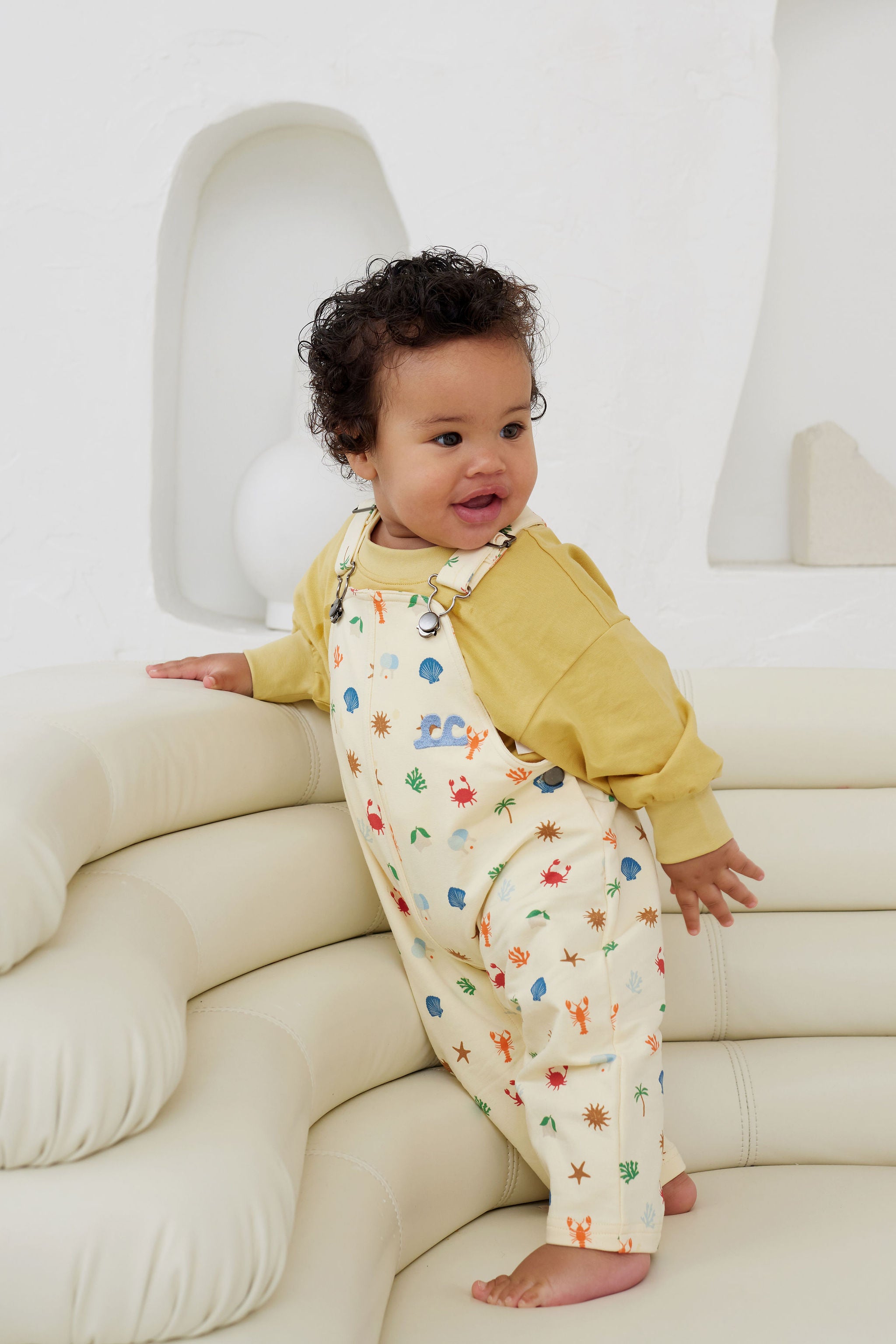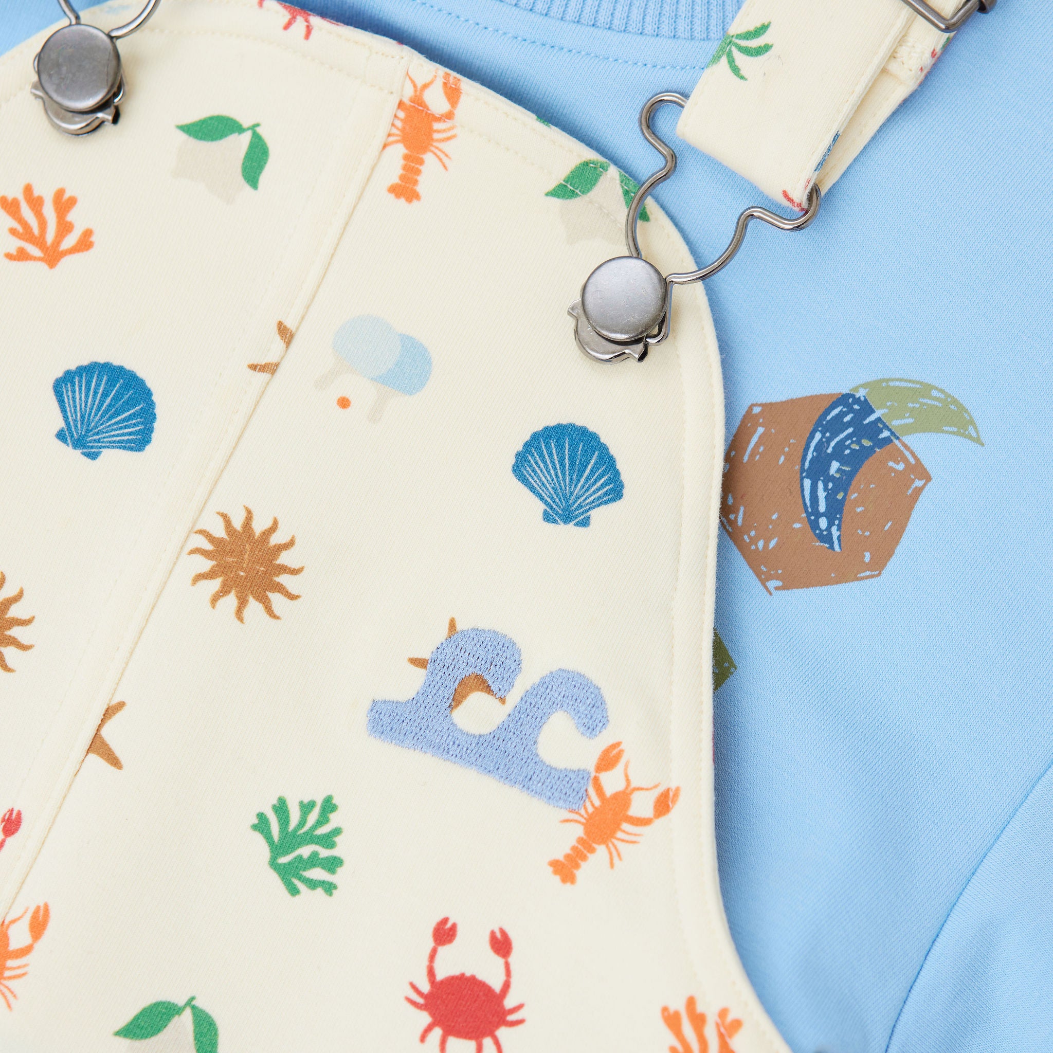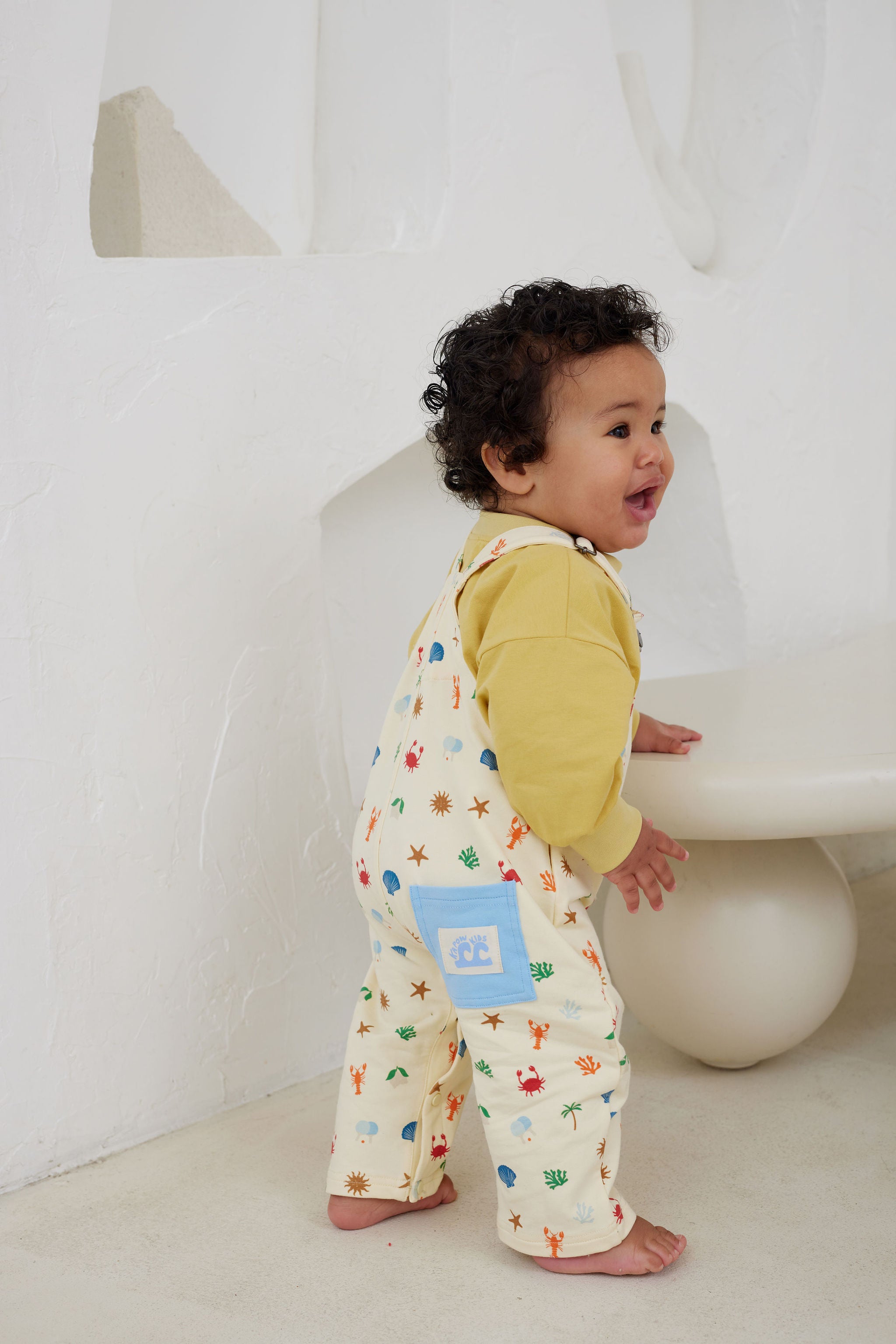 Dive into seaside style with these cosy sweatshirt overalls featuring adorable crab, starfish, lobster and shell motifs! Soft, snuggly fabric makes them perfect for beach days or casual hangouts, while the fun ocean-inspired motifs spark imagination and wanderlust. The comfy fit and adjustable straps mean they'll keep up with your little explorer through countless adventures. Whether building sandcastles or just soaking up the summer vibes, these overalls are a beachy-keen wardrobe must-have that'll have them grinning from ear to ear. Designed in Melbourne, Australia, made ethically and slowly in China 95% cotton, 5% spandex french terry fabric. Adjustable overall straps. Snaps at crotch. Slouchy fit. Back pocket