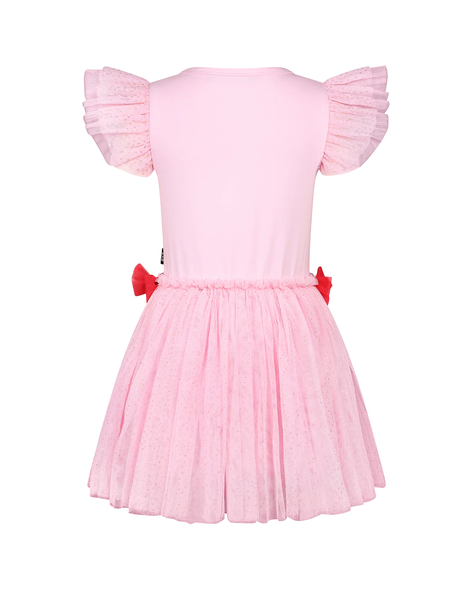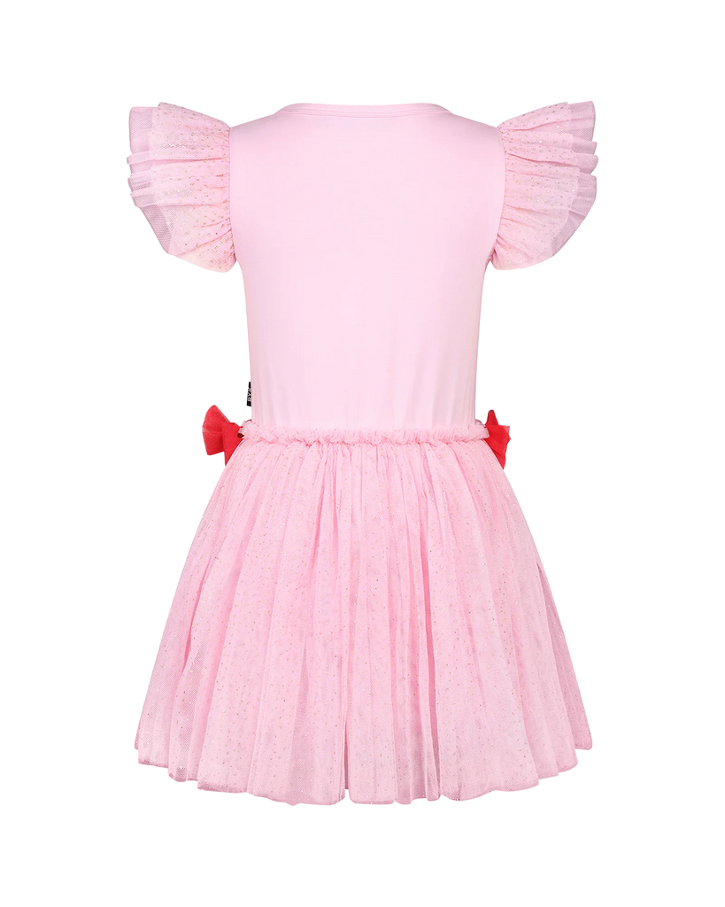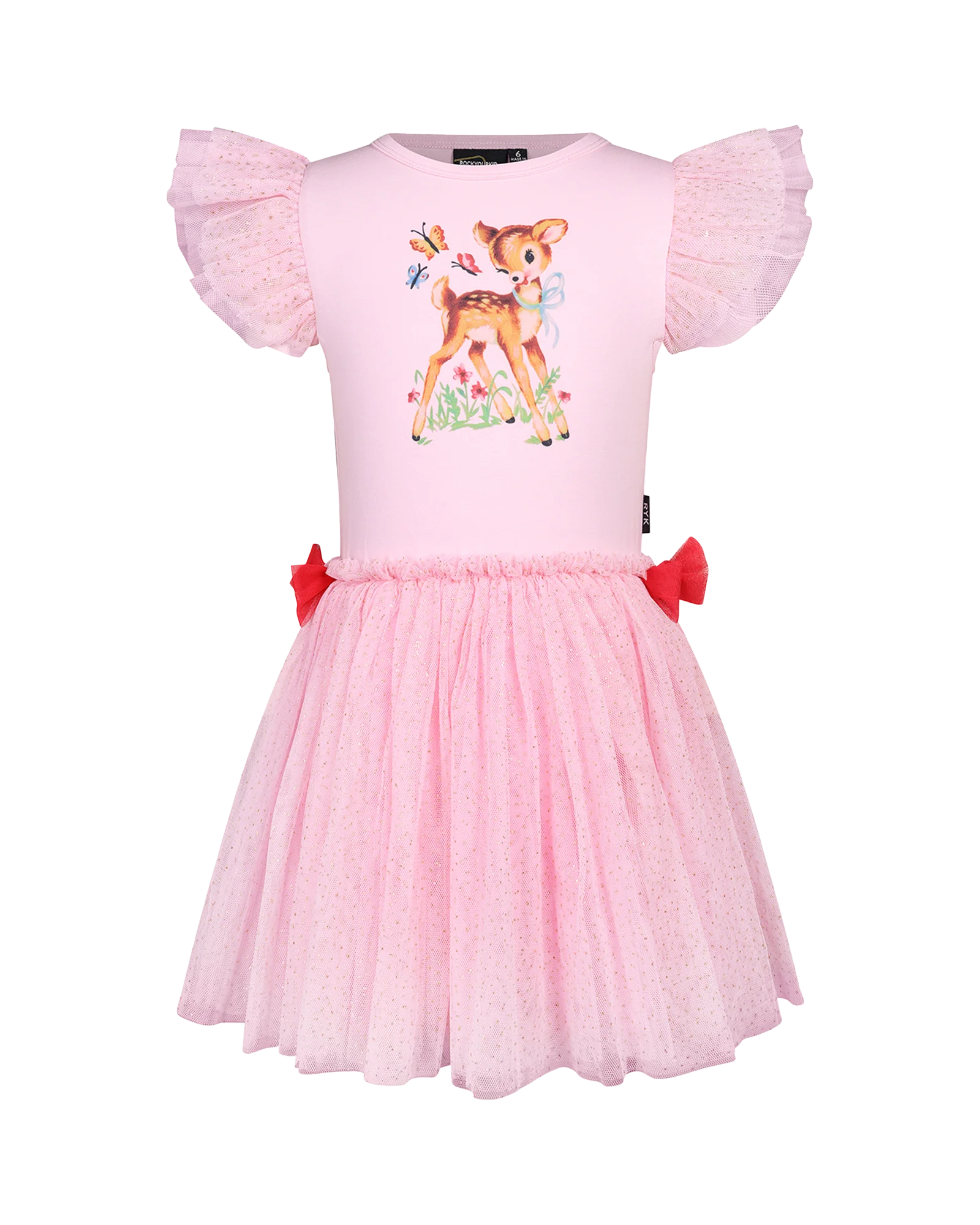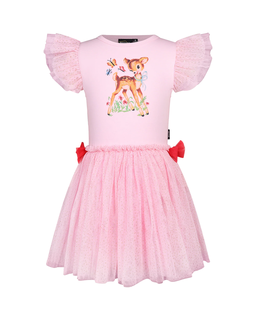 Bring summer magic to playdates and parties with the Baby Deer Fairytale Dress. The pink candy cotton jersey bodice features frill sleeves and a charming retro baby deer print, while the tulle skirt sparkles with gold spots and subtle red bows on the waistband.