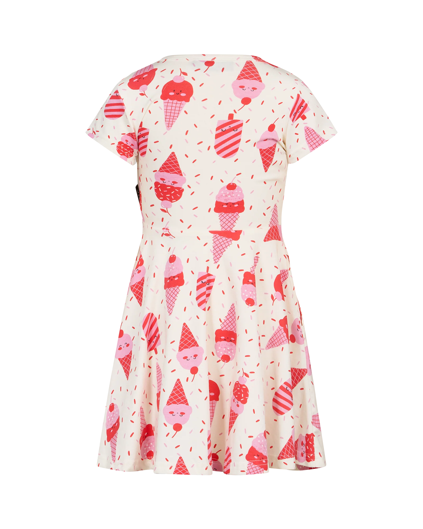 Add a sprinkle of summer fun with the Ice Cream Cherry Short Sleeve Waisted Dress. This playful cotton-elastane dress has a short-sleeve t-shirt style top with an all-over ice cream print on a cream base, and a soft pink waisted skirt that's perfect for twirls and playtime.