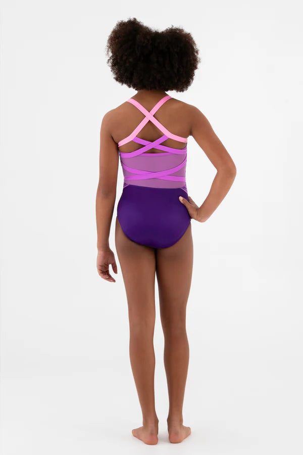 Sweet, playful and all things fabulous. The Gemstone Leotard features an intricate purple ombre print with delicate linework bursting across the body. Styled in a classic scooped neckline with wide straps for support, the back features crisscross straps that are layered over a mesh back panel. Made from a combination of mesh and our signature printed stretch fabric that is matt in look, & durable with a great stretch. A full front lining and elasticated legs have been added for the ultimate in coverage and comfort. SP branded logo on the front hip of this garment.