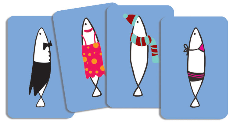 A fun 15-minute observation and memory game. Each player has 5 sardine cards face down in front of them. A large box of sardines card is then revealed for a few seconds to all of the players before being hidden again. Each player may then look at their 5 cards, and choose the ones they think were in the box of sardines. Correct guesses will win you a point, but incorrect guesses will lose you TWO points, so watch out. The player with the most points once all the cards are gone is the winner.