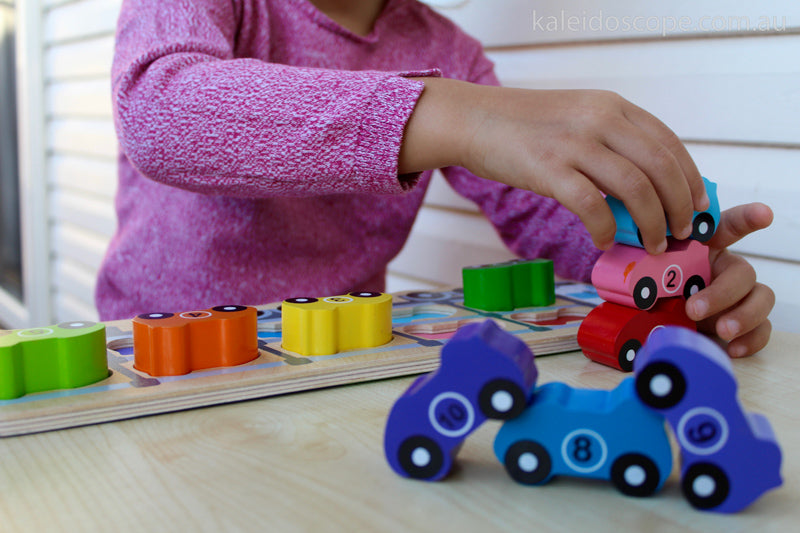 - Asking the child to name the numbers on the cars as they are being placed into the corresponding numbers on the board and then count from 1 to 10 aloud.