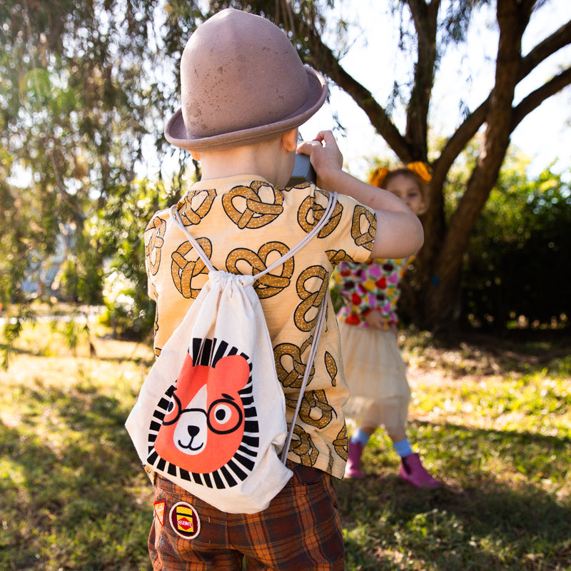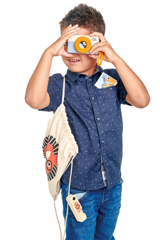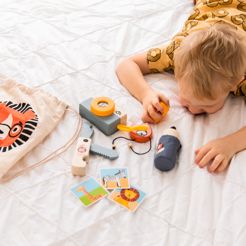 This adorable wooden set is all your little one needs for their adventure. Inside the printed drawstring bag you will find;